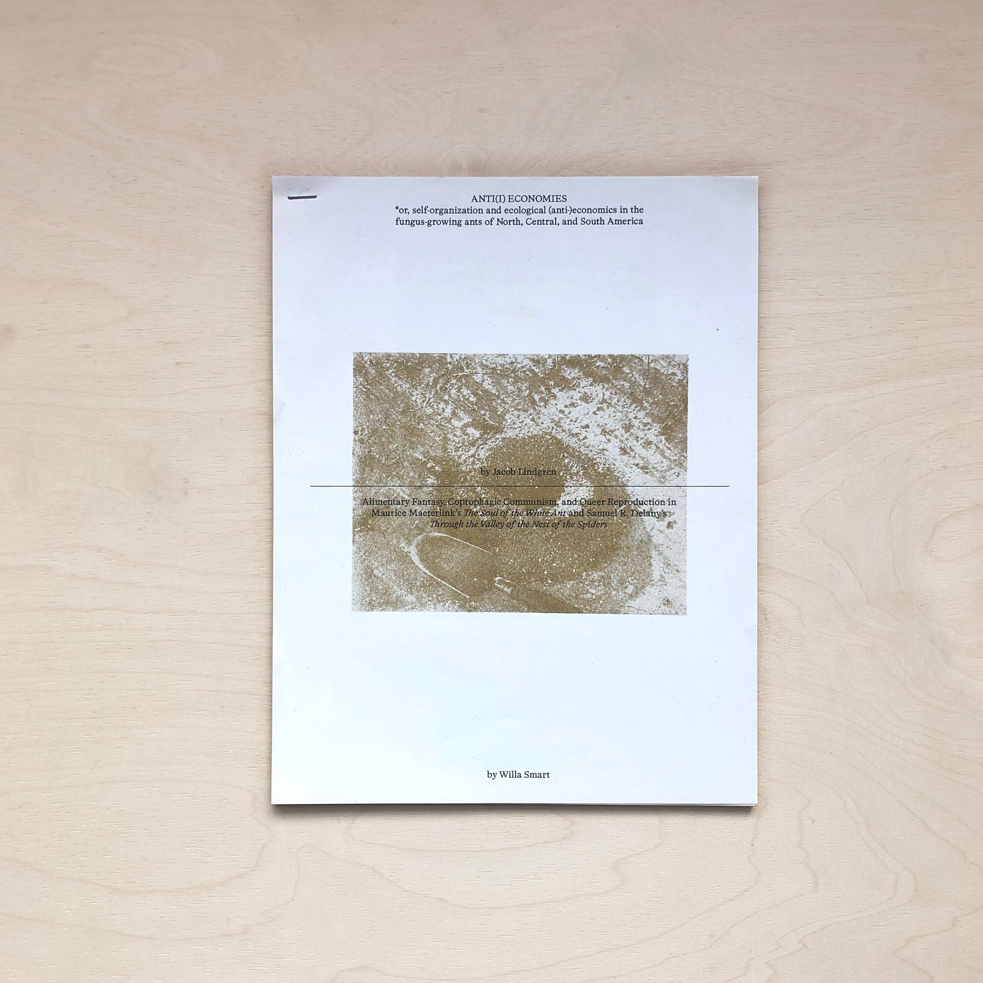 "Ant(i) Economies" (an in-progress essay) by Jacob Lindgren and "Alimentary Fantasy, Coprophagic Communism, and Queer Reproduction in Maurice Maeterlink’s The Soul of the White Ant and Samuel R. Delany’s Through the Valley of the Nest of the Spiders" by Willa Smart. Self-organization in ants, ecological (non) economies, un"natural" sexual constructs, transformative fantasies, and a queer alimentarity. Includes interwoven, facsimile reproductions of instances of economic anthropomorphism in scientific literature, novels, and cinema surrounding fungus-growing leafcutter ants (Atta and Acromyrmex) and the convergent histories of agriculture between humans and insects.