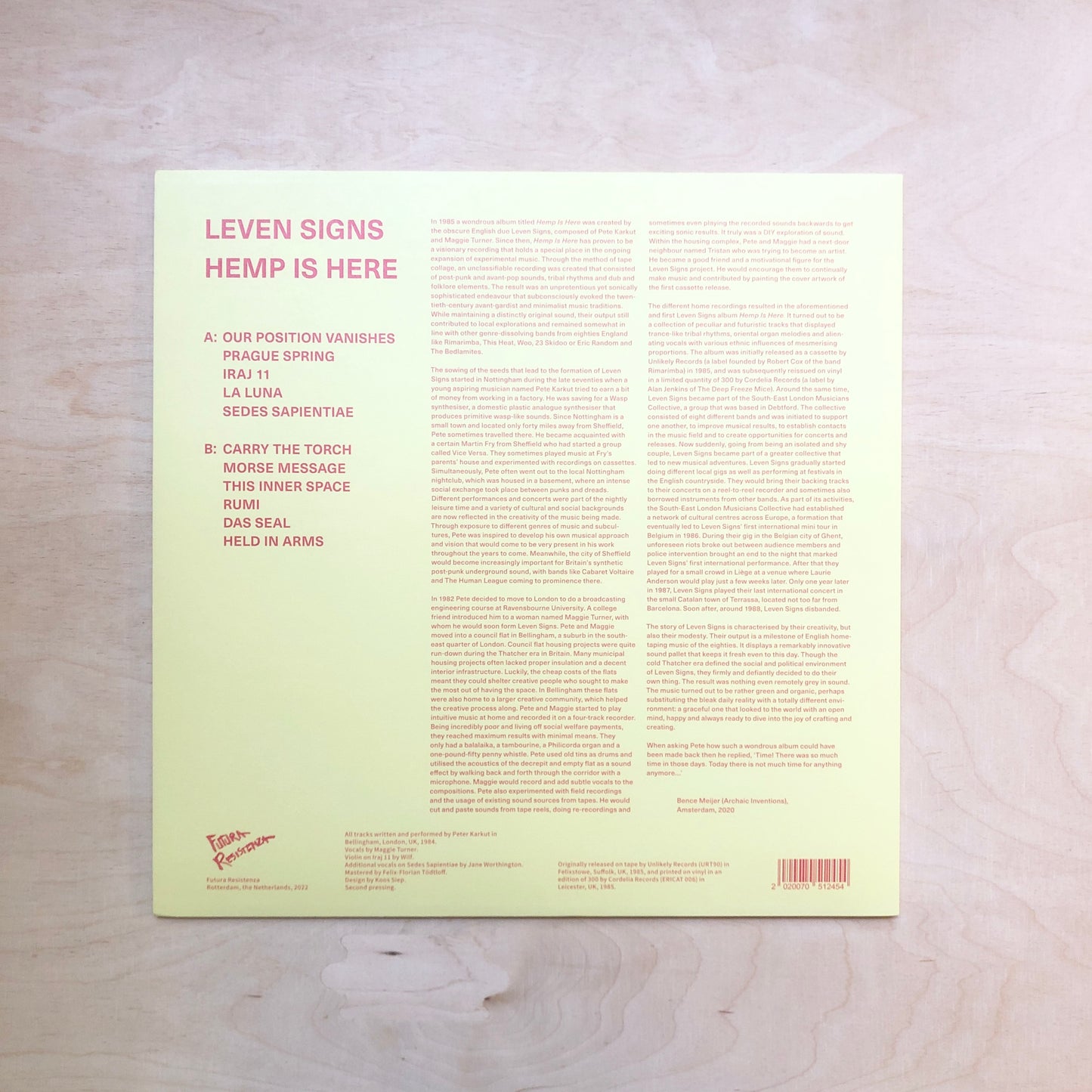 In 1985 a wondrous album titled Hemp Is Here was created by the obscure English duo Leven Signs, composed of Pete Karkut and Maggie Turner. Since then, Hemp Is Here has proven to be a visionary recording that holds a special place in the ongoing expansion of experimental music. Through the method of tape collage, an unclassifiable recording was created that consisted of post-punk and avant-pop sounds, tribal rhythms and dub and folklore elements. The result was an unpretentious yet sonically sophisticated endeavour that subconsciously evoked the twentieth-century avant-gardist and minimalist music traditions. While maintaining a distinctly original sound, their output still contributed to local explorations and remained somewhat in line with other genre-dissolving bands from eighties England like Rimarimba, This Heat, Woo, 23 Skidoo or Eric Random and The Bedlamites.