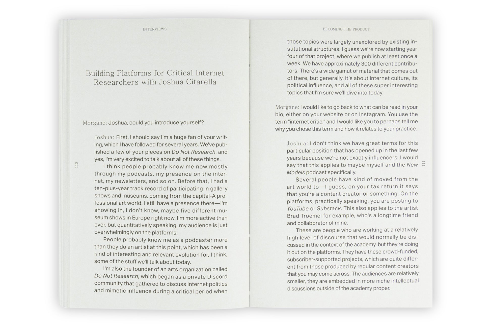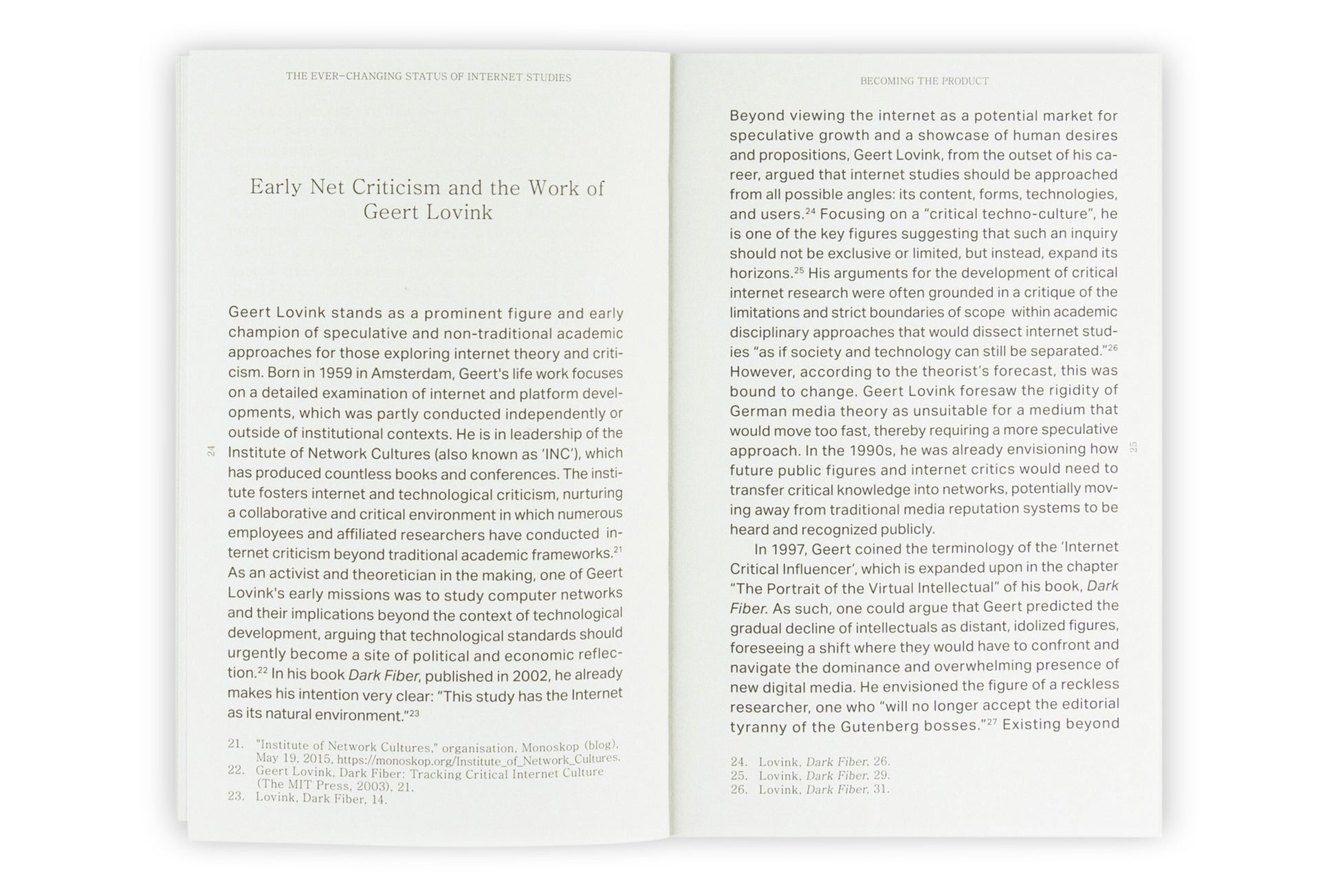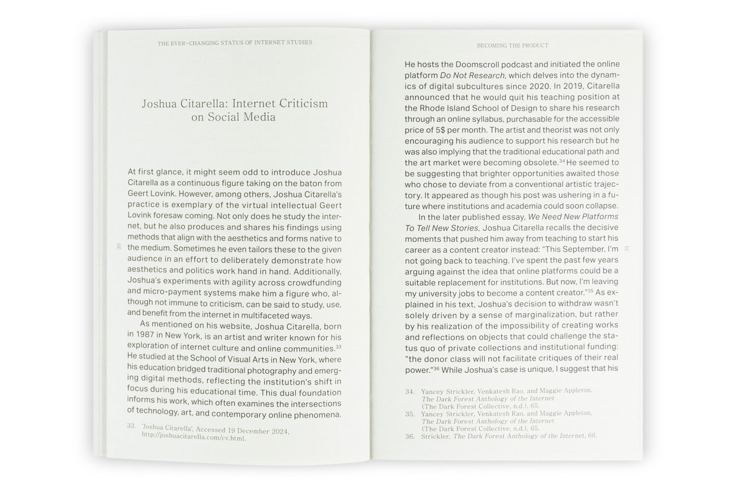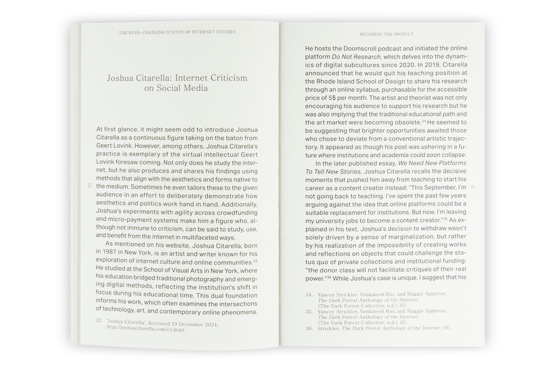 In Becoming the Product: The Critical Internet Researcher as a Virtual Intellectual, the evolution of critical internet research takes center stage. By examining the pioneering work of early net critic Geert Lovink and the influencer-style approach of internet theorist Joshua Citarella, as well as the practices of Alex Quicho and Sophie Public, this essay delves into the diverse strategies internet researchers adopt to share their work and sustain their careers more or less independently in today’s era defined by the attention economy.