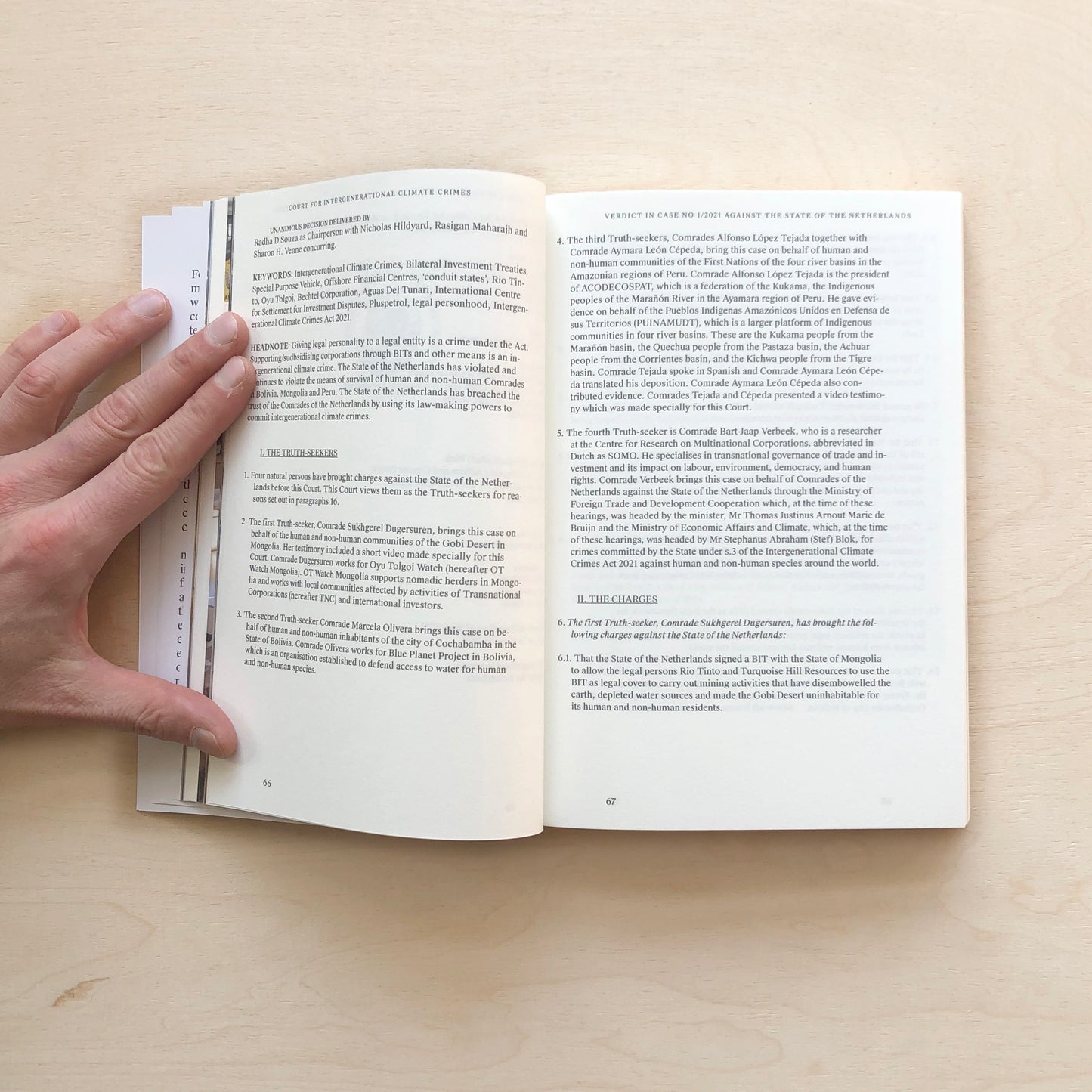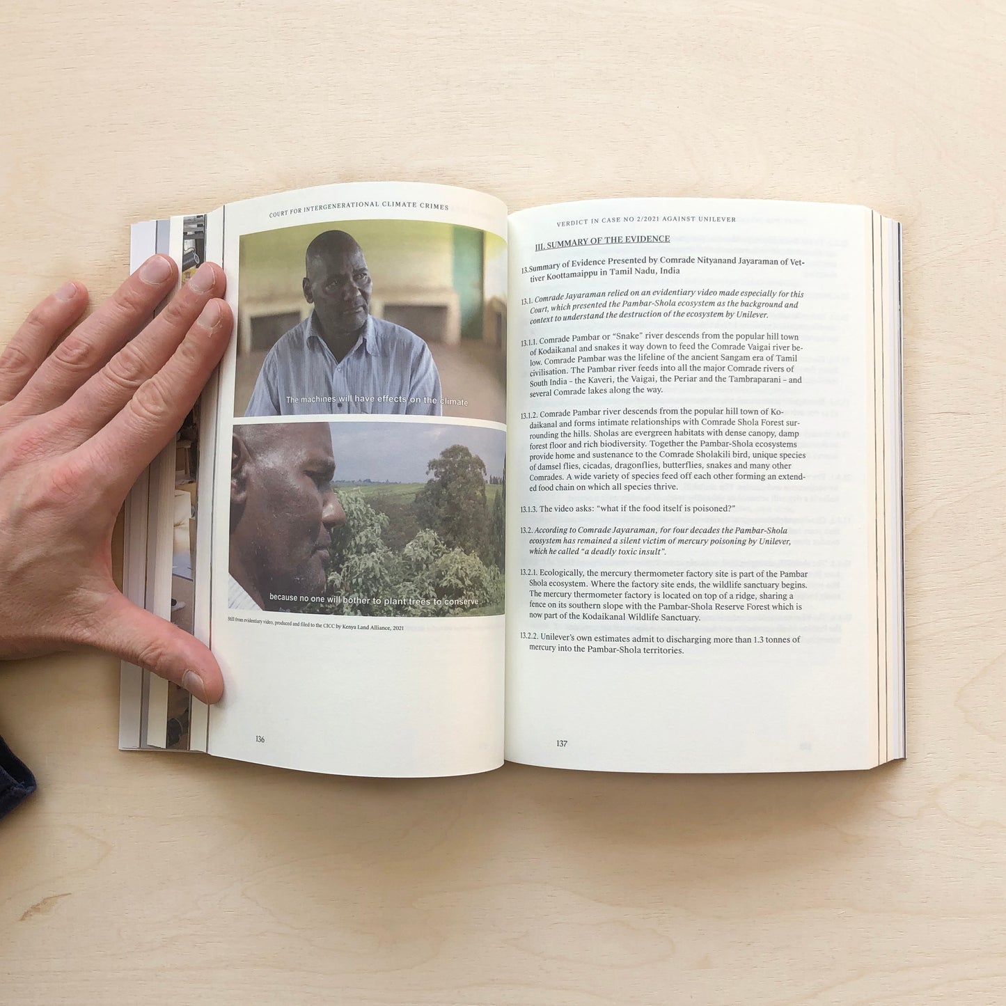 The Court for Intergenerational Climate Crimes (CICC) is a collaboration between Framer Framed, Indian academic, writer, lawyer and activist Radha D’Souza and Dutch artist Jonas Staal. The project consists of a large-scale installation in the form of a tribunal that prosecutes intergenerational climate crimes. The aim of the CICC is to prosecute climate crimes committed by states and corporations, not only in the past and present, but also in the future. Central to this book is the first iteration of the project, commissioned and staged by Framer Framed, Amsterdam, during which public hearings were held against the Dutch State and transnational corporations registered in the Netherlands: Unilever, ING and Airbus.