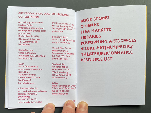 FIELD GUIDE BERLIN (4th ed.) is a collection of lists; of businesses*, organisations and locations that support artists/curators/makers/creatives/crafters/designers do what they do. FGB is based on over 15 years of our own research and in addition to contributions by a multitude of creative professionals. The A6 publication (Riso printed and designed & researched in 2025 at our studio) is 48 pages long and has over 475 listings in chapter segments that include a myriad of important locations for the creative; art stores, graffiti supply stores, foundries, laser cutting, fabric stores, crate makers, photo print & image correction labs, photo supplies, film/talent agencies, sound/dialog editing, offset/digital/letterpress/riso printing, book binding, courier services, art production documentation, and more!