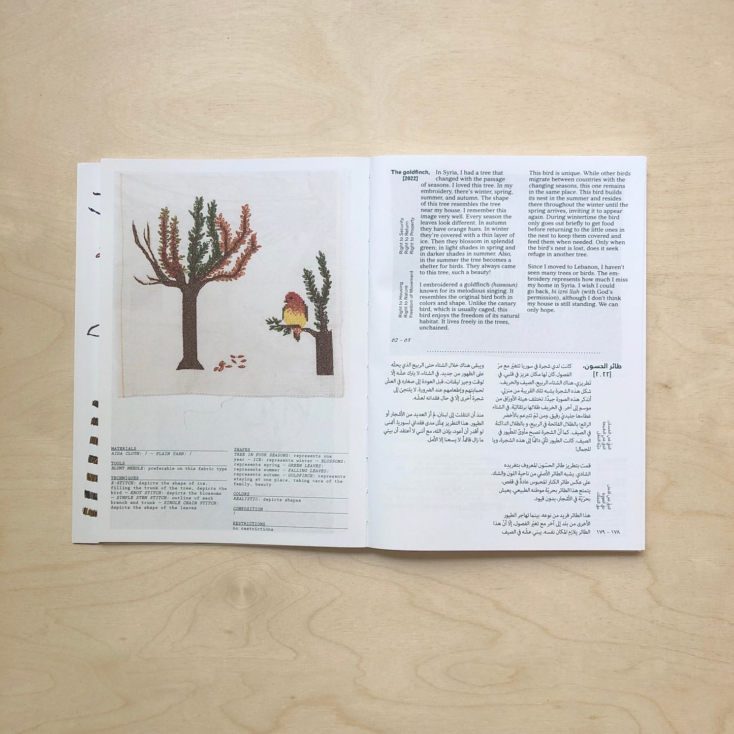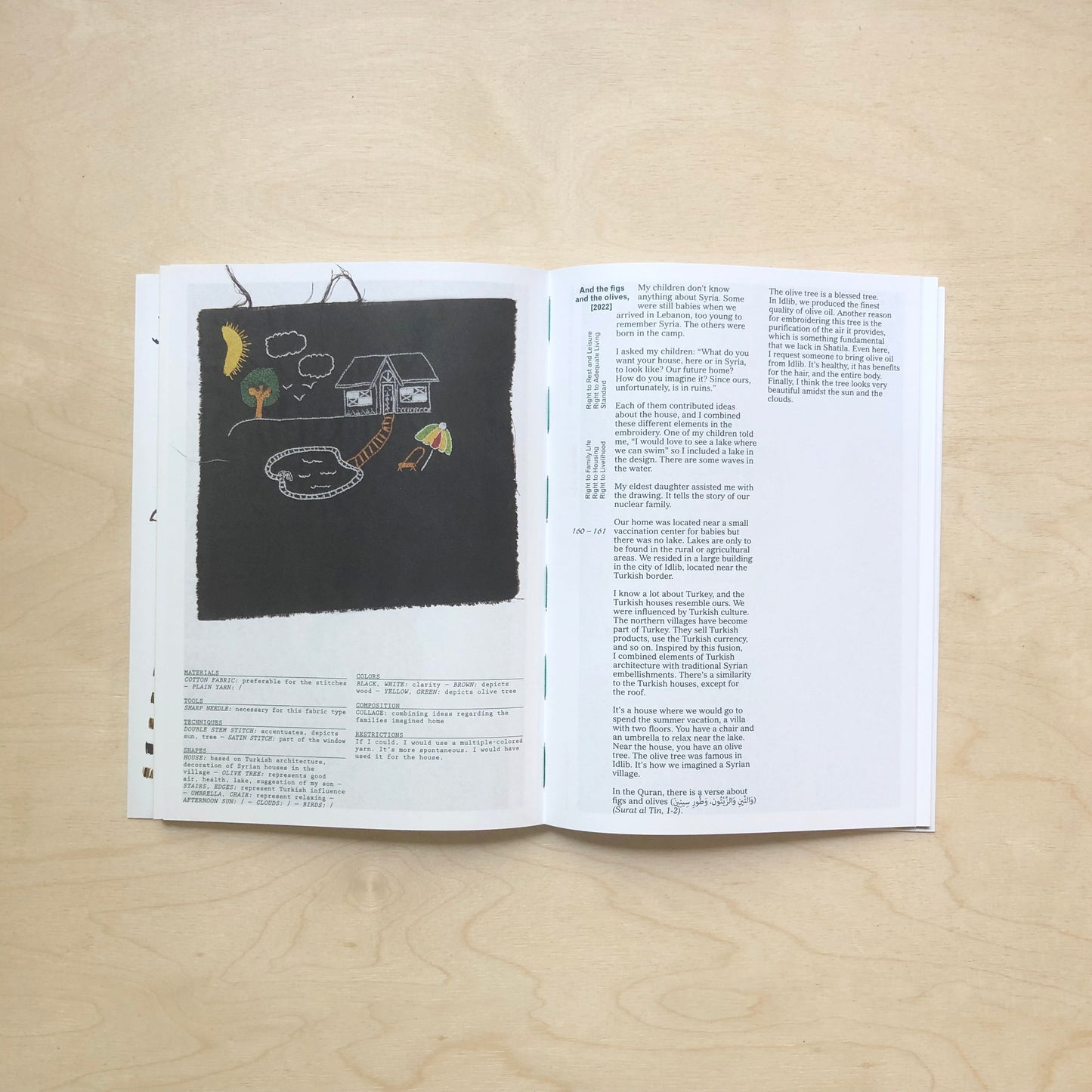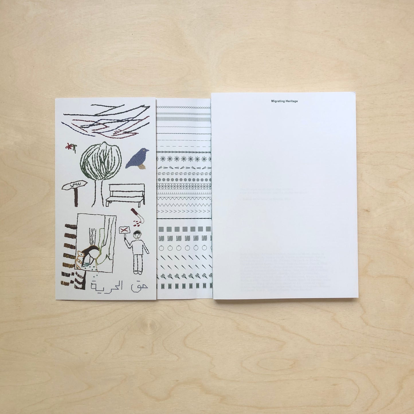 The book ‘Migrating Heritage’ stems from the artistic research project of Sofie Verclyte about embroidery’s narrative function. It features individual embroidered stories of Syrian women living in Shatila, co-created embroidered collages, and photographs taken by photographer Aaron Lapeirre that visualize the (making) context.