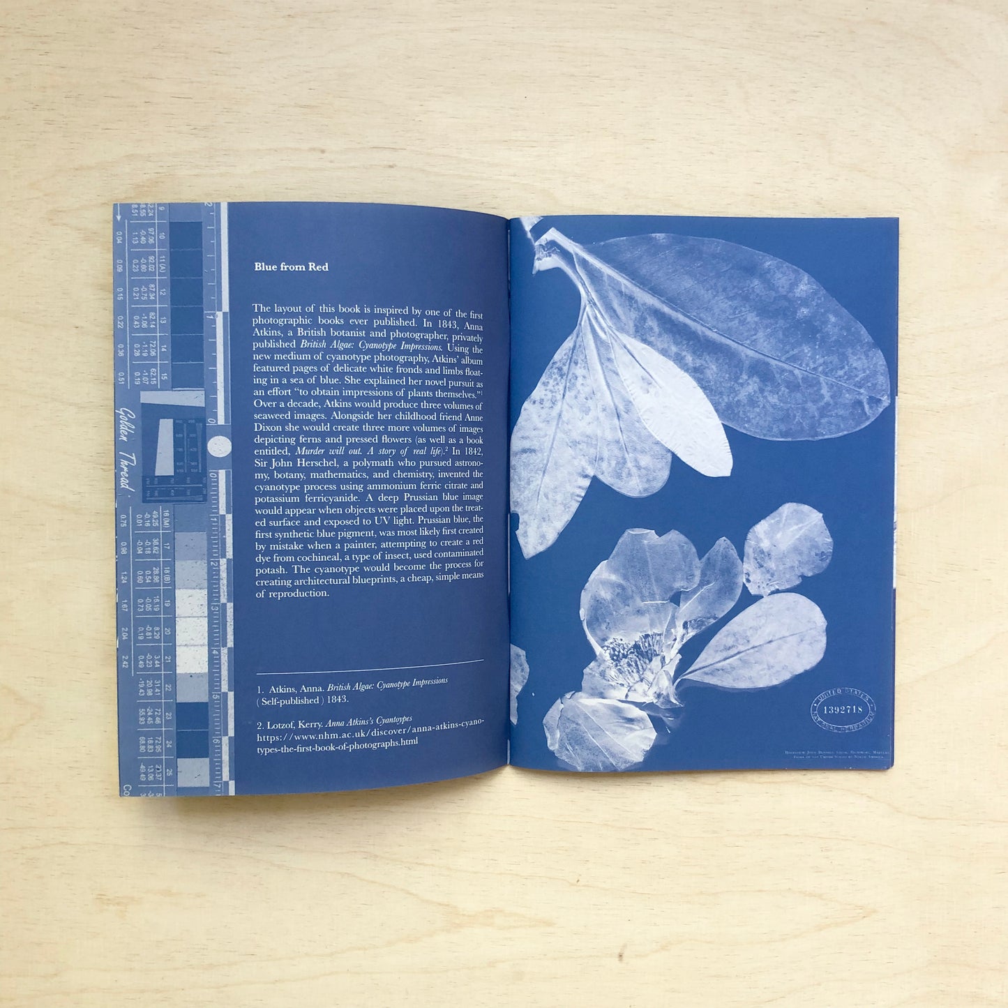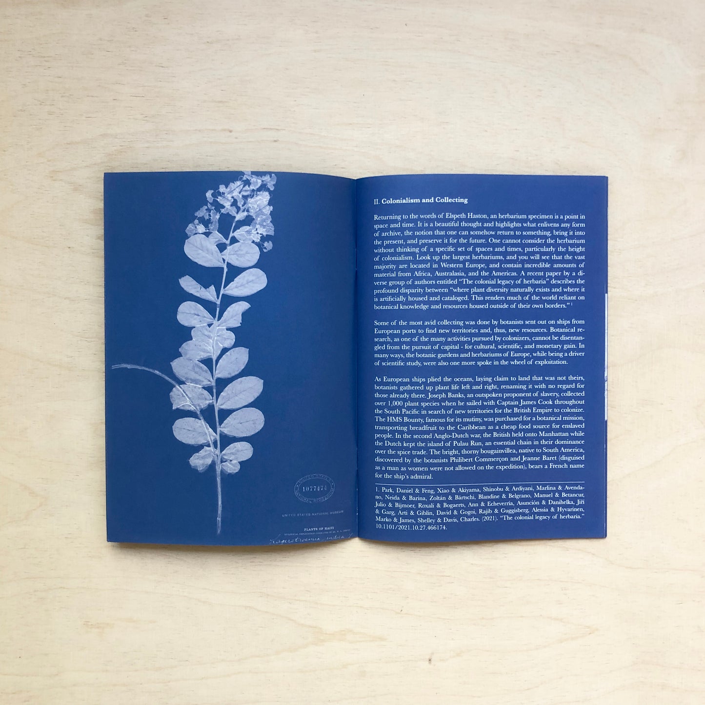 The Dry Garden is a publication composed of vignettes and reimagined material from herbaria, where plants are dried and stored for scientific purposes. The publication reconsiders archival histories and explores how narrative can help us build more empathetic relationships with nature. Visually, the publication is a nod to Anna Atkins’ Photographs of British Algae: Cyanotype Impressions, the first book of photographs ever published. Touching on subjects of colonialism, public access to science, the catty humor of botanists, and ecological catastrophes, the texts detail our inherent need as humans, with all of our virtues and failings, to make sense of the world.