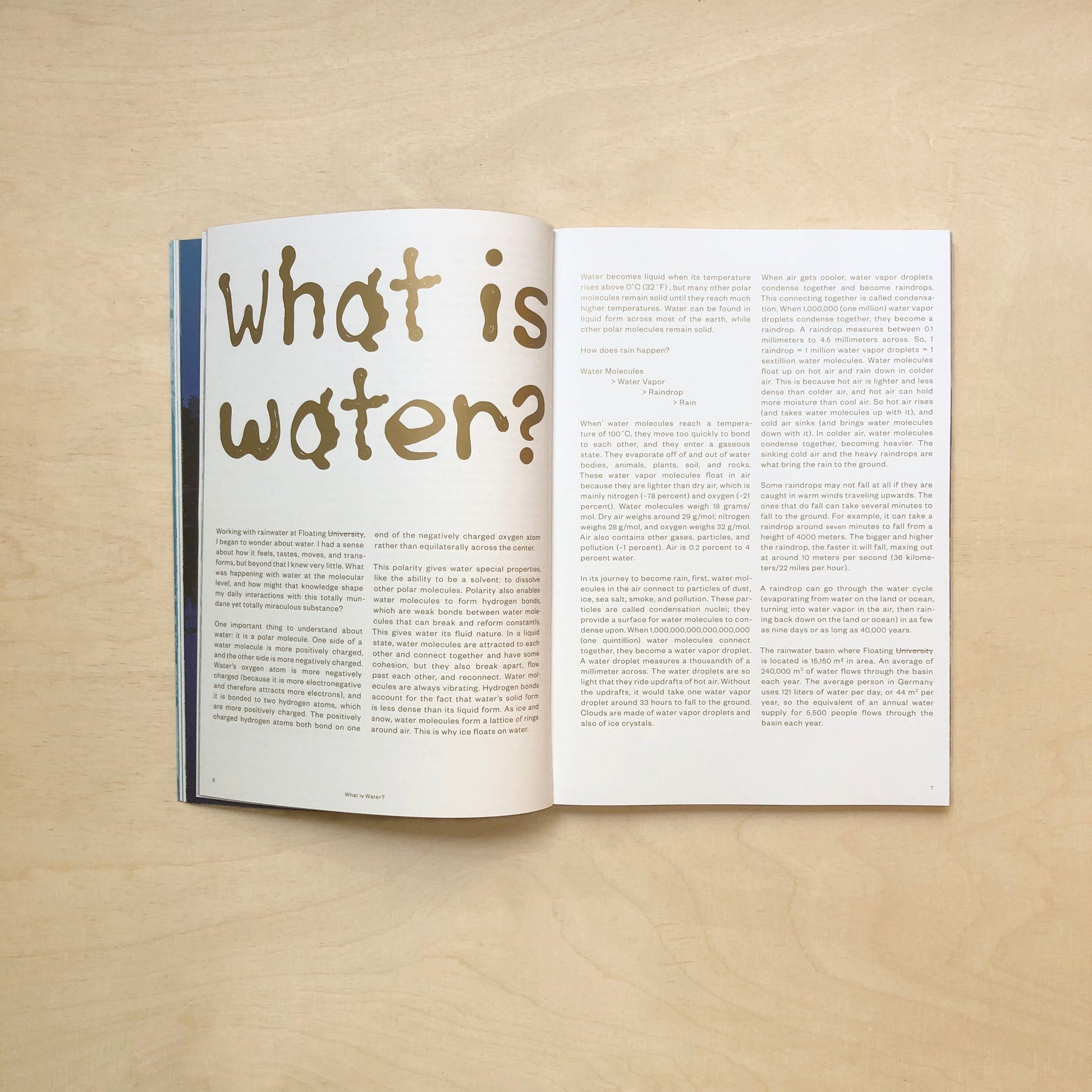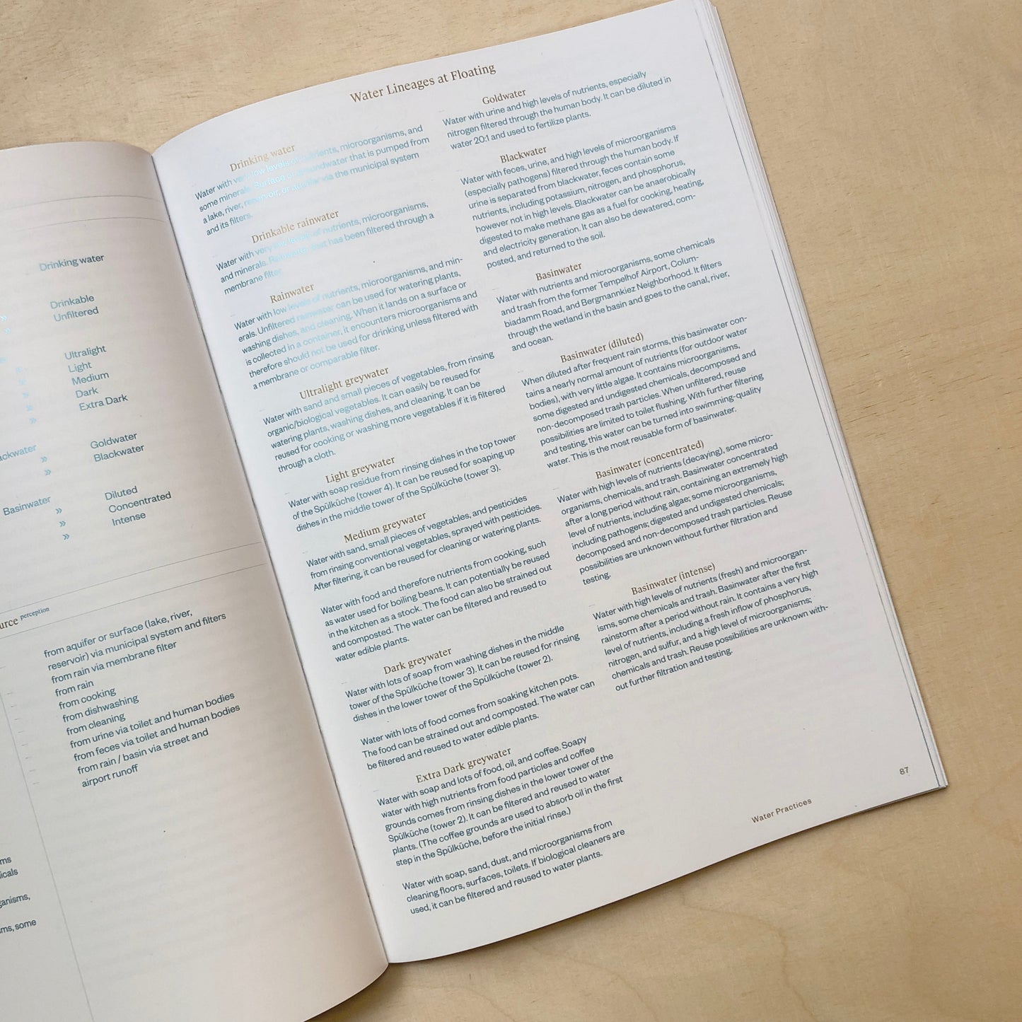 This book shares the story of organic water filtration systems and other practices relating to water at Floating University Berlin. The manuscript flows through strategies and manuals, oral histories and infrastructures concerning the four main types of water filtered on site: rainwater, basin water, blackwater, and the many shades of greywater. Embedded in the literary representation of Floating University’s public pedagogy, this text collection includes artifacts of seminars, workshops, performances, practices, and discussions that ruminate on our position in the water cycle. katherineball.com