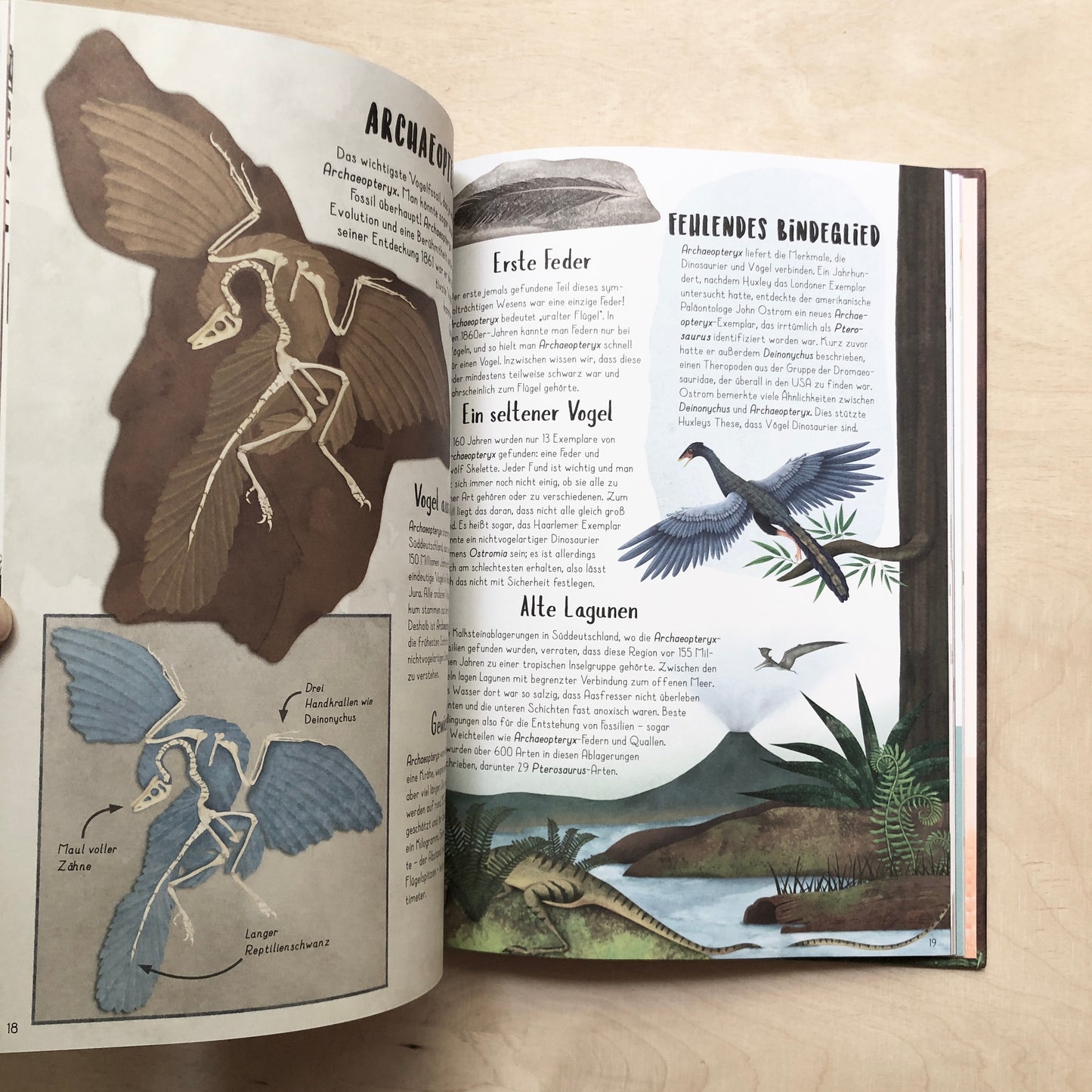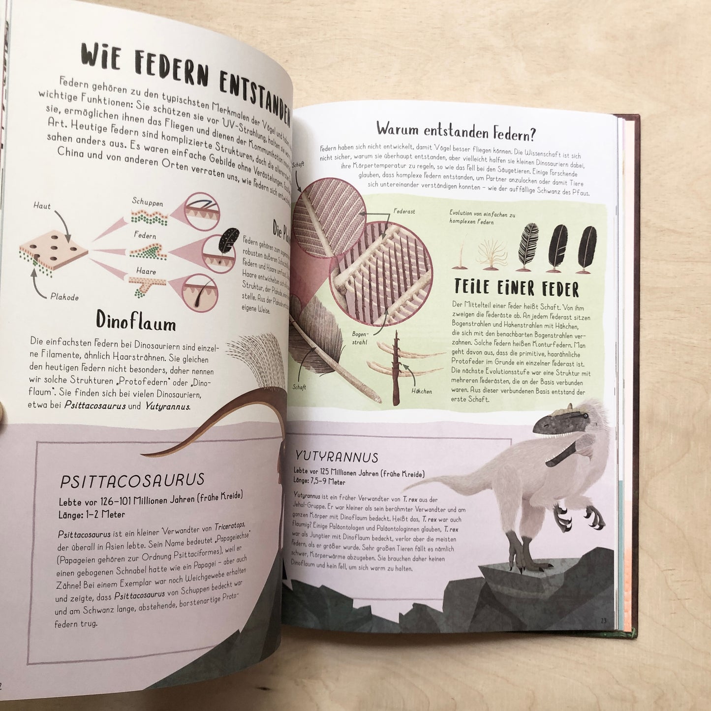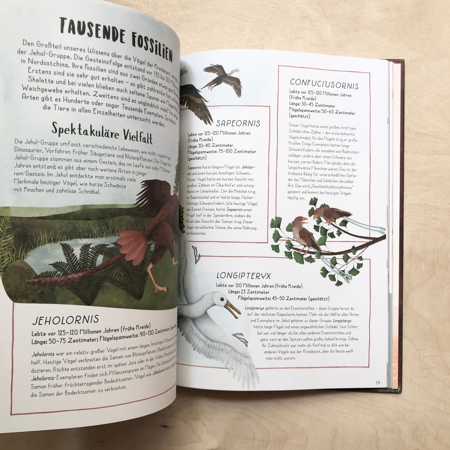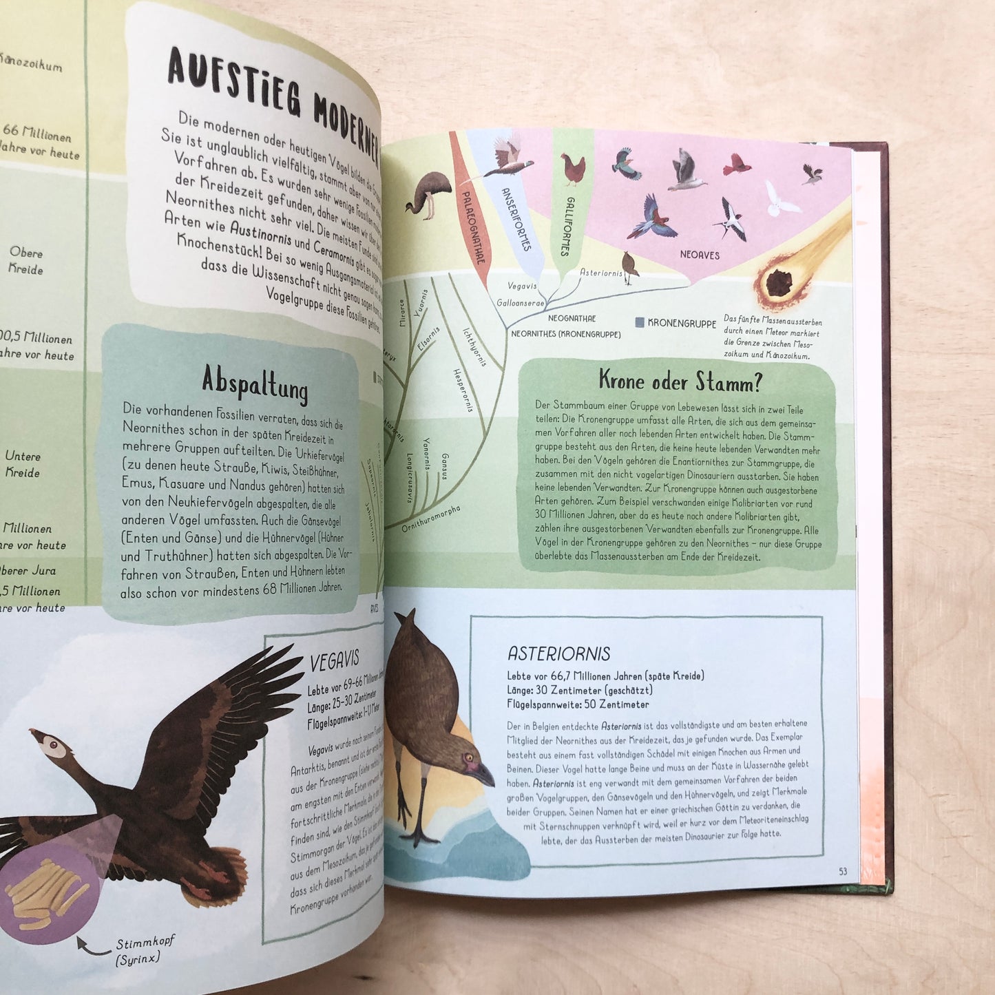 Wer hätte gedacht, dass die Nachfahren der Dinosaurier heute noch auf der Erde leben? Dieses Kindersachbuch begibt sich auf eine spannende Entdeckungsreise in eine Zeit, in der Dinosaurier flugfähig und schließlich zu den Vögeln wurden, die heute unseren Himmel bevölkern. Kinder erfahren darin, woher Vögel abstammen und viele weitere faszinierende Fakten über die Evolution. Beispielsweise lernen sie, dass die ältesten Vogelfossilien etwa 150 Millionen Jahre alt sind, dass Vögel aus einer Gruppe fleischfressender Dinosaurier hervorgegangen sind und das Huhn eigentlich vom T-Rex abstammt und dass die ersten Vögel noch scharfe Zähne hatten, die sich dann zu Schnäbeln entwickelten.