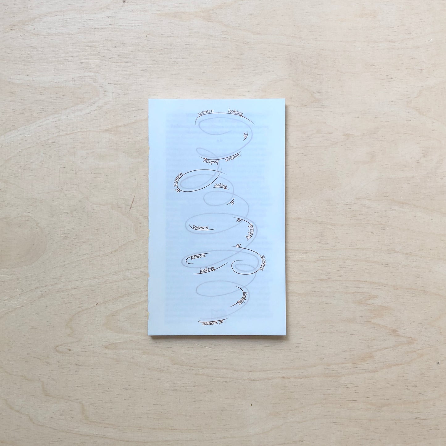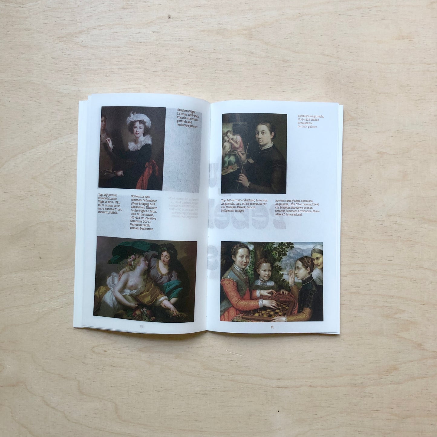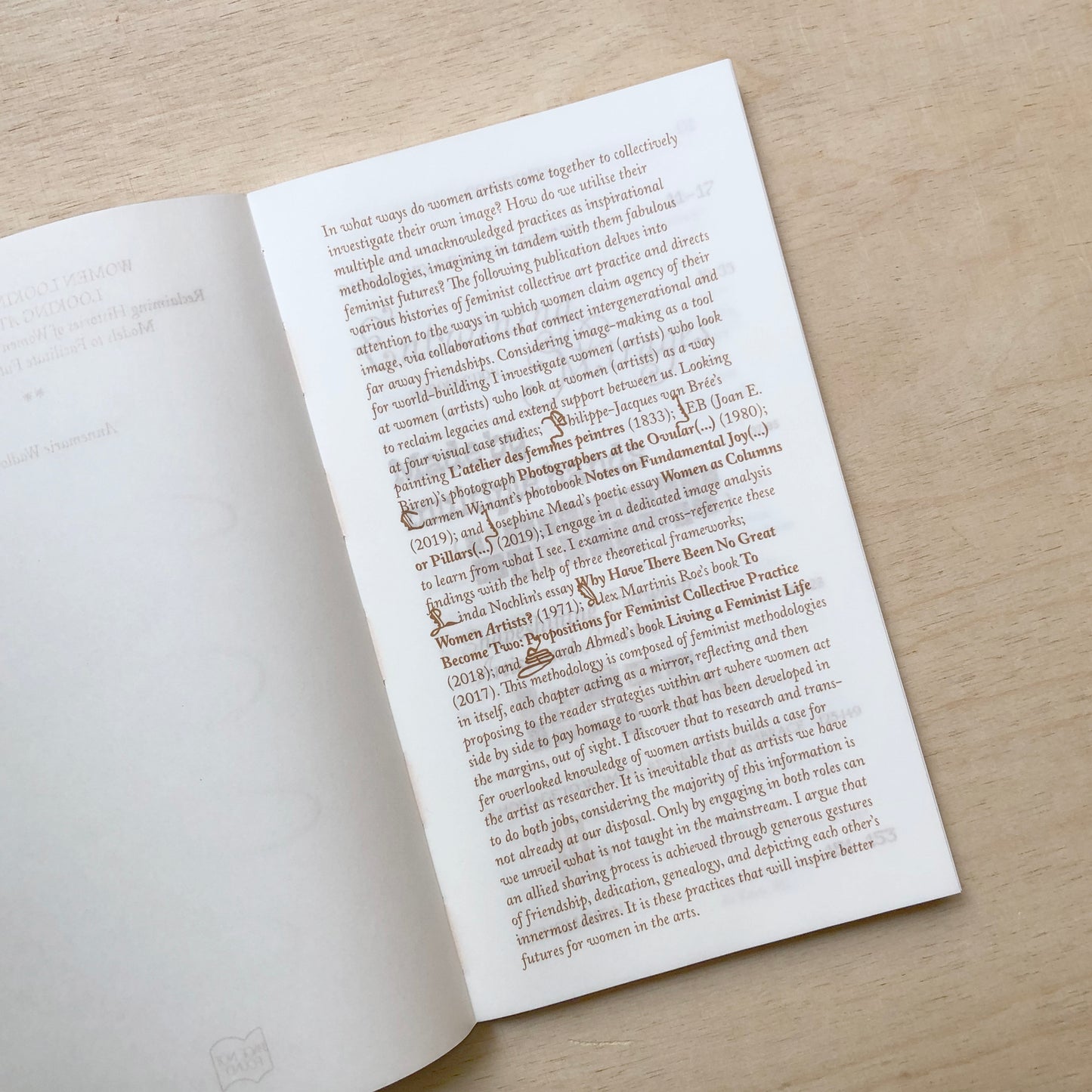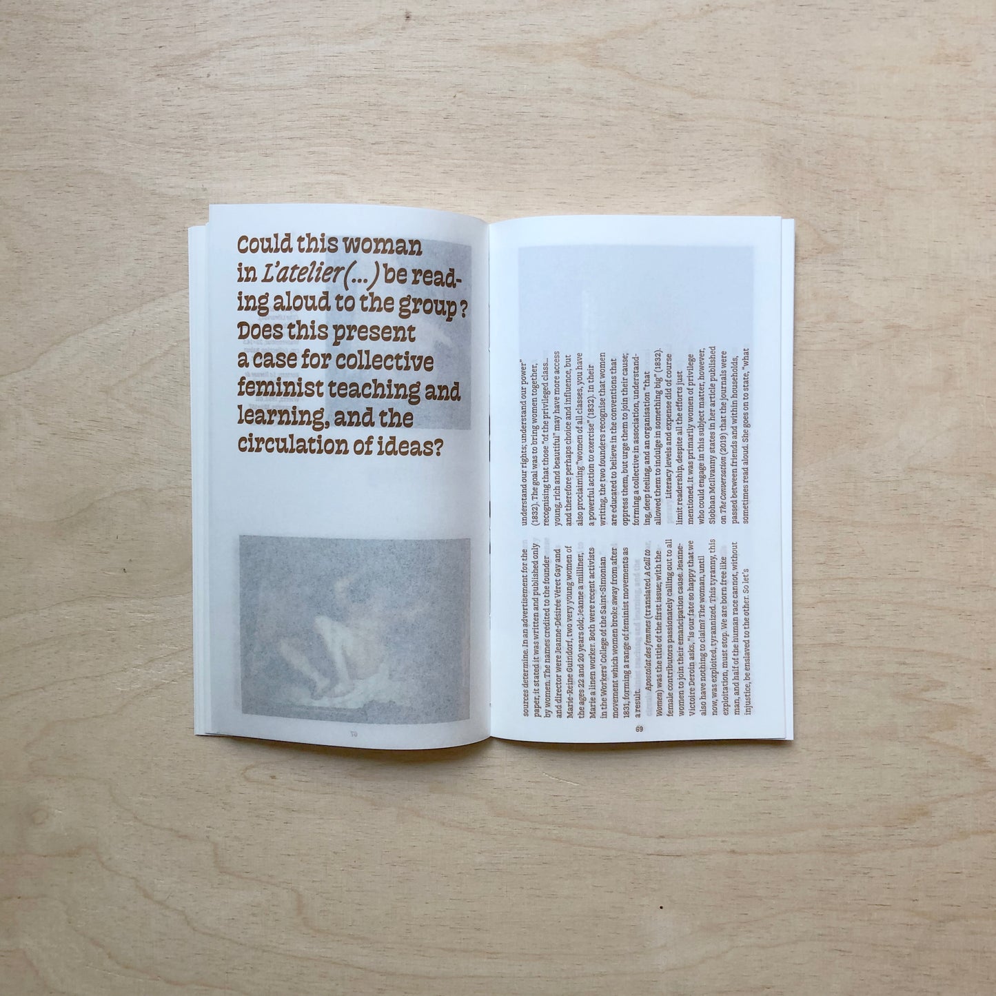 The booklet ‘Women Looking at Women’ by Annemarie Wadlow examines the ways women artists come together to collectively investigate their own image. It delves into various histories of feminist collective art practice and focuses on how women claim agency of their image through collaborations which connect intergenerational and long-distance friendships. Wadlow examines four visual case studies: ‘L’atelier des femmes peintres’ (1833) by Phillippe-Jacques van Bree, ‘Photographers at the Ovular’ (1980) by Joan E. Biren, Carmen Winant’s photobook ‘Notes on Fundamental Joy’ (2019), and the poetic essay ‘Women as Columns of Pillars’ (2019) by Josephine Mead.