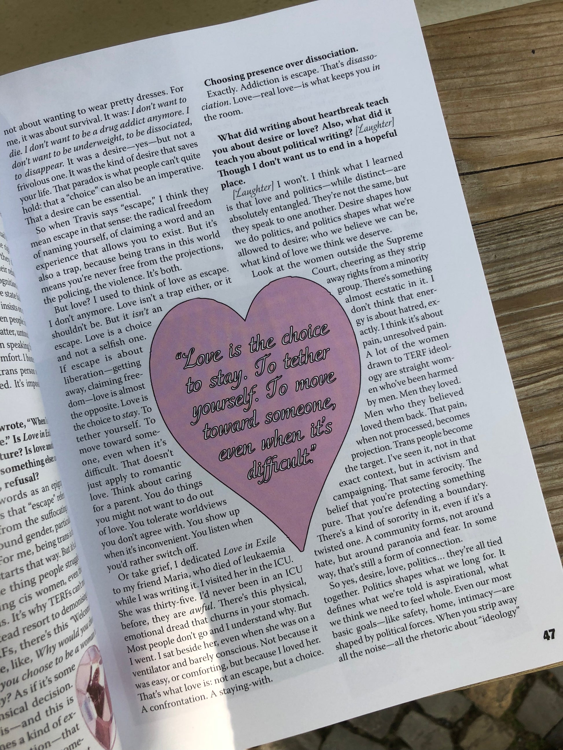 Set against the backdrop of state-sanctioned transphobia in the UK and US, ongoing genocide in Gaza, and a litany of global injustices that see us staggering under the weight of collective and personal upheaval, this issue reckons with thinking and writing about love in a time of crisis. How do we take seriously the seemingly frivolous demands of love, devotion, beauty—in all their myriad and sometimes painful forms—when basic needs and rights are stripped away.